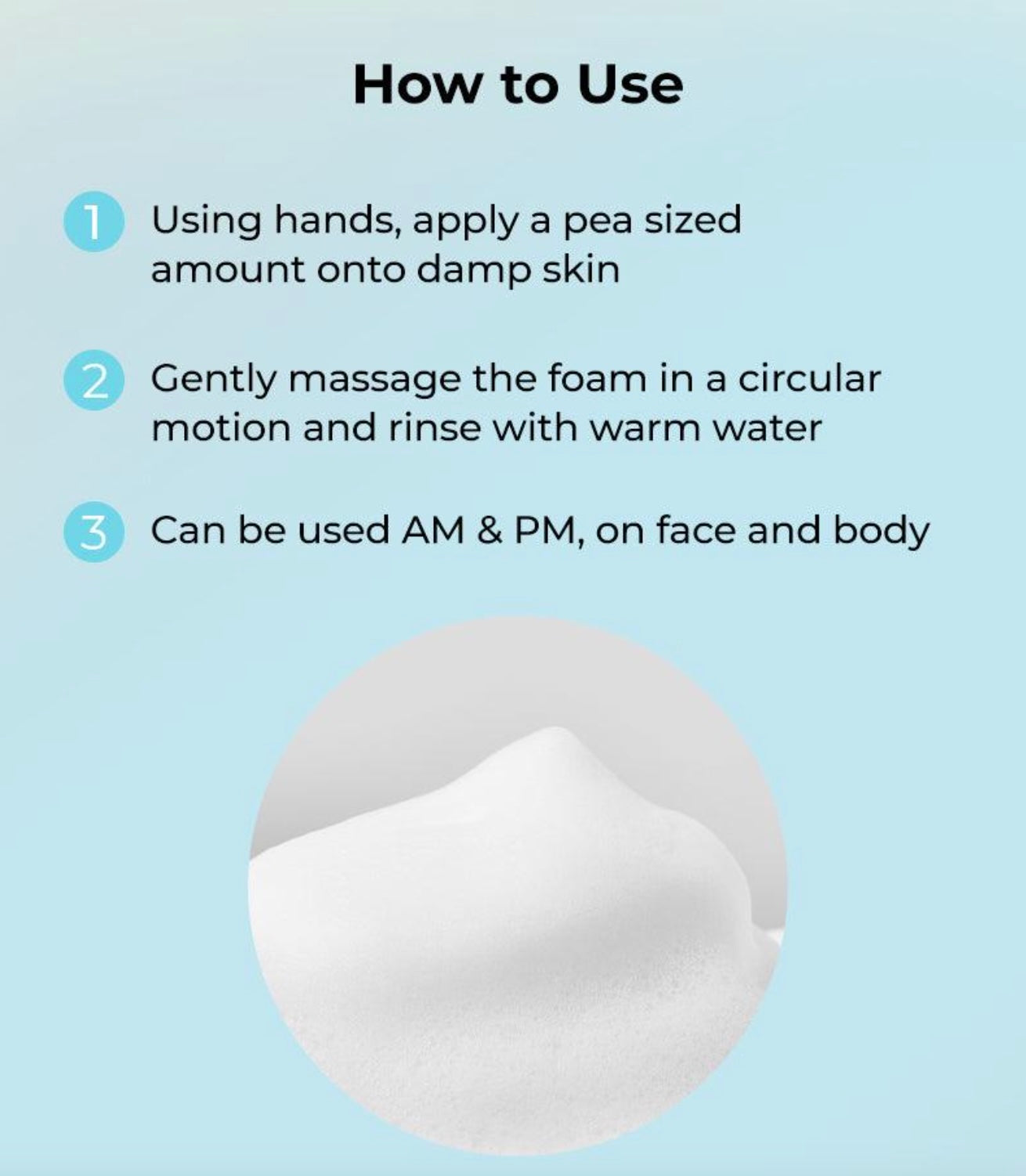 Use an appropriate amount and lather with wet hands. Apply to wet face and gently massage onto face in circular motion. Avoid the eye area. Massage for 1-2 minutes. Rinse with lukewarm water. Use this foam cleanser as part of the morning and evening routine.